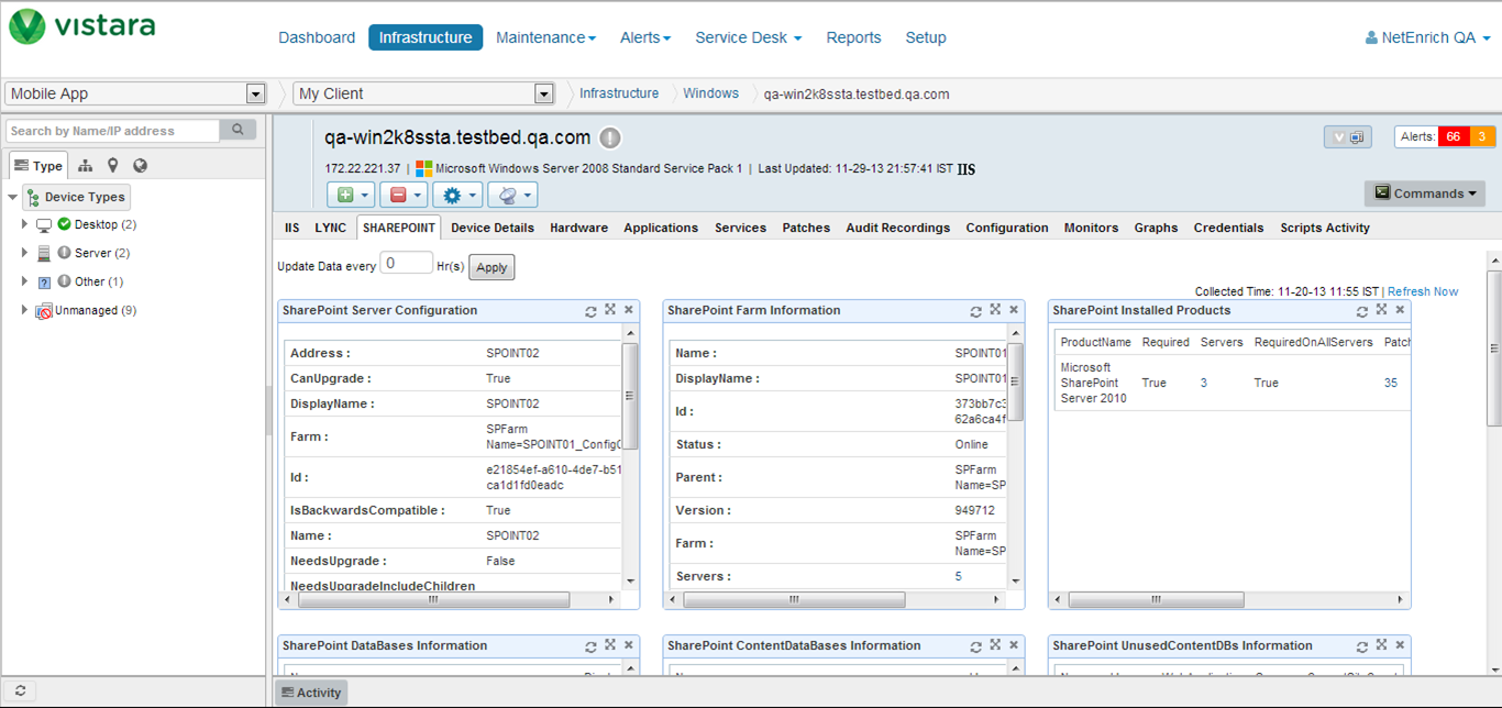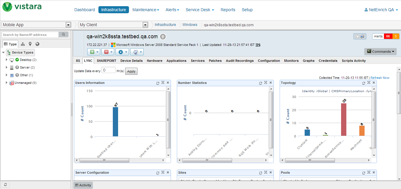 Vistaraは、Microsoft SharePointおよびLyncの主要なパフォーマンスおよび構成データのダッシュボードを、Active Directory、Exchange、IIS、SQLServerなどのMicrosoftアプリケーションの既存のダッシュボードに追加するようになりました。 Lyncダッシュボードは、サーバー構成、サーバーの役割、サービスとプロセスの情報、およびユーザー情報に関する情報を提供します。